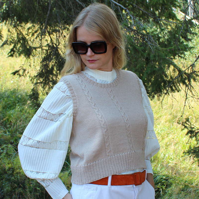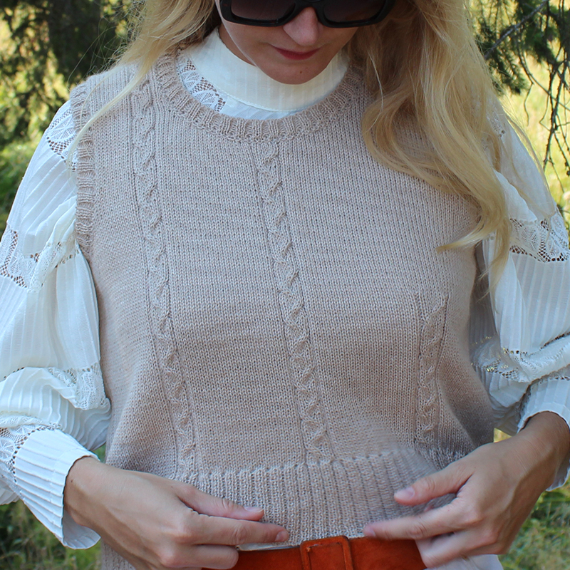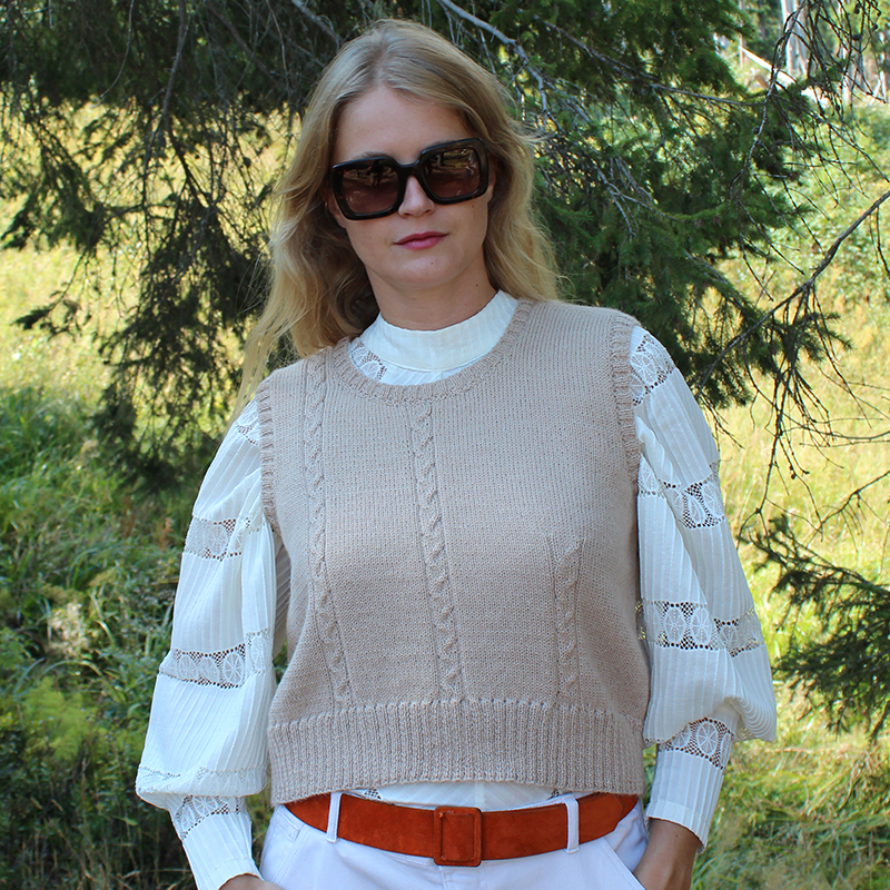 This alpaca tank top is offered here in a natural sand beige color, very chic.
